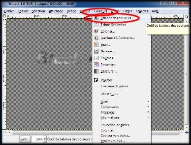 Dans la boite de notre image, un clic gauche sur le menu : Couleurs, et un clic gauche dans le sous-menu sur : Balance des couleurs. (img40)