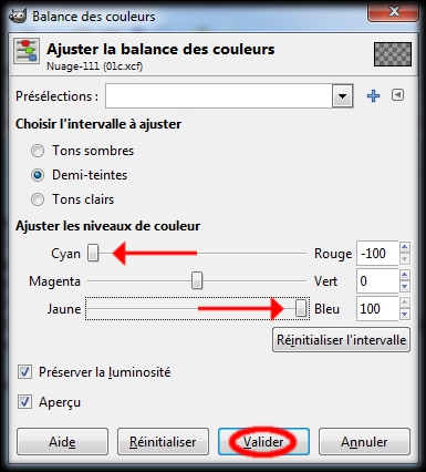 La boite : Balance des couleurs vient d'apparaître. (img42)Elle dispose de trois glissières pour : Ajuster les niveaux de couleur. La première glissière, déplacez-là à fond sur la gauche (sur Cyan).(Pour déplacer une glissièreun clic gauche que l'on garde enfoncé sur son bouton, on déplace la souris et on relâche le clic quand la glissière est a l'endroit voulu.)La deuxième on n' y touche pas.La troisième, à fond sur la droite (sur bleu).Et un clic gauche sur Valider.
