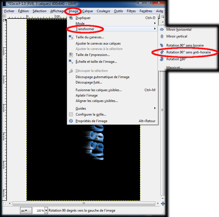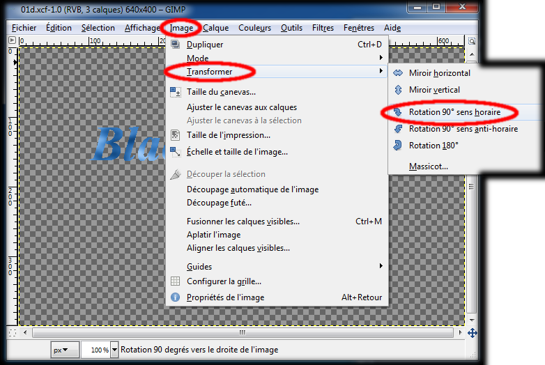 Dans la boite de l'image un clic gauche sur le menu : Image, placez le curseur de votre souris sur : Transformer,et un clic gauche sur : Rotation 90° sens anti- horaire. (img60)