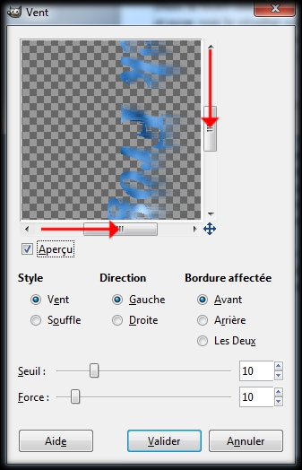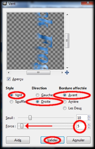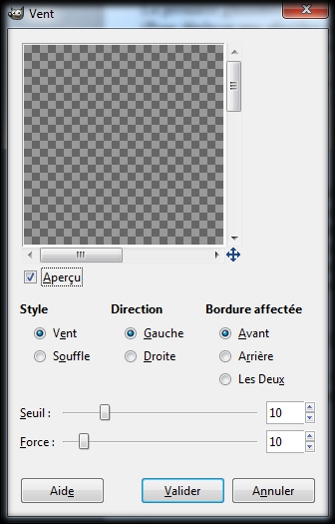 Modifions les valeurs de cette boite Vent.Tout d'abord : Style, par défaut : Vent , est sélectionner, on n'y touche pas.Après : Direction, par défaut : Gauche, bah là non, nous on sélectionne : Droite (Un clic gauche sur le rond devant Droite)Puis, Bordure affectée, par défaut : Avant, on ne touche pas. Et puis il nous reste les deux glissières du bas : Seuil que l'on va laisser par défaut sur 10, et la glissière : Force qui elle va passer de 10 par défaut, à 5 (un clic gauche sur le bouton de la glissière et sans relâcher le clic déplacez la souris,puis relâchez le clic.) OK, clic gauche sur Valider et c'est dans la poche. (img58)