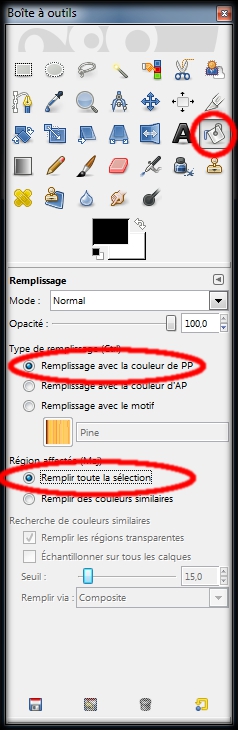 Dans la boite à outils un clic gauche sur : Outil de remplissage. En dessous les valeurs de cet outil sont maintenant affichées.Nous allons modifier dans : Type de remplissage et sélectionner : Remplissage avec la couleur de PP. (un clic gauche sur le rond devant ce texte dans la boite à outils) (img51)Région affectée et sélectionner : Remplir toute la sélection. Dans la boite image un clic gauche