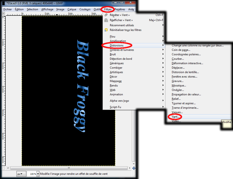 Dans la boite image, un clic gauche sur le menu : Filtre, déplacez le curseur de votre souris dans le sous-menu sur : Distorsions,puis un clic gauche sur : Vent... (img56)