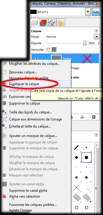 Pour renforcer l'effet, nous allons dupliquer le calque nuage, dans la boite des calques un clic droit sur Nuage et un clic gauche sur : Dupliquer le calque.(img62)