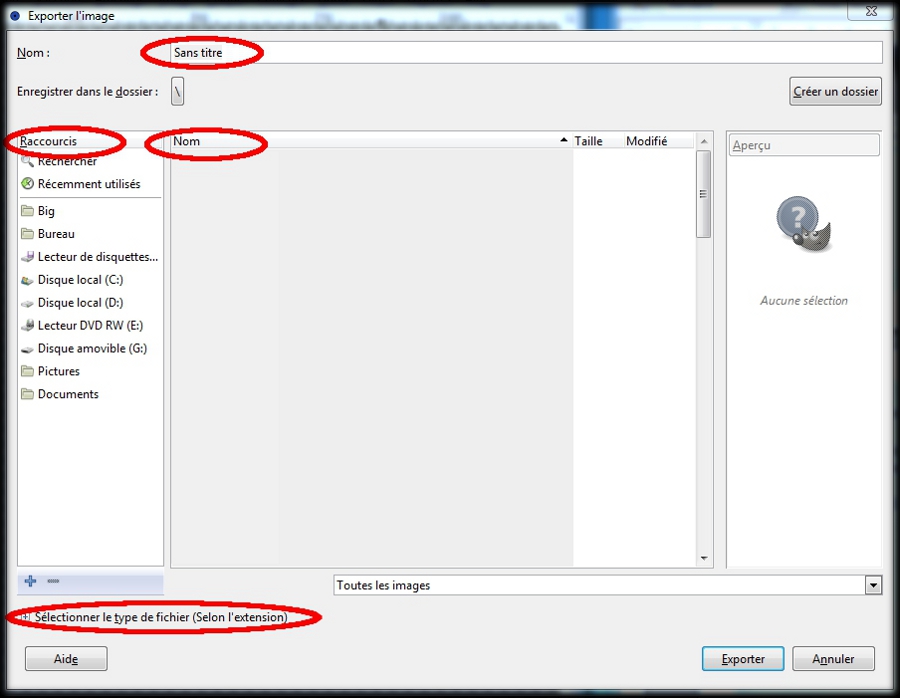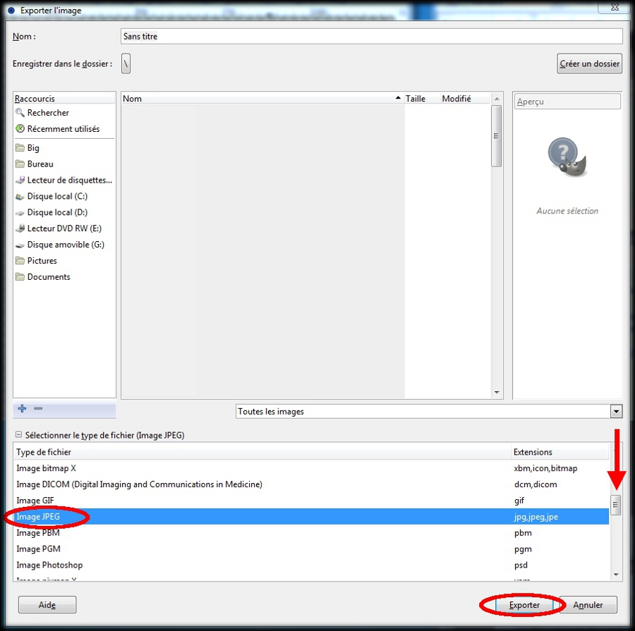 La boite : Exporter l'image apparaît. (img67a)En haut de cette boite il y à Nom : suivi de : Sans titre (si vous n'avez effectué aucune exportation), ou le nom de votre dernier enregistrement suivi de l'extension .xcf Un clic gauche à coté de Sans titre (ou du nom), garder le bouton enfoncé de la souris et sans le relâcher faîtes glisser votre souris sur Sans titre (ou le nom) et relâcher le bouton , le fond bleu indique que nous l'avons bien sélectionné.Rentrez à l'aide du clavier le nouveau nom (ex: congel fini) Dans raccourcis, un clic gauche sur : Disque local, puis dans Nom (le tableau juste à coté de raccourcis) sélectionnez le fichier dans lequel l'exportation doit s'effectuer. Tout en bas il y a une petite croix suivit de : Sélectionner le type de fichier (Selon l'extension)Un clic gauche sur la petite croix. (img67a)