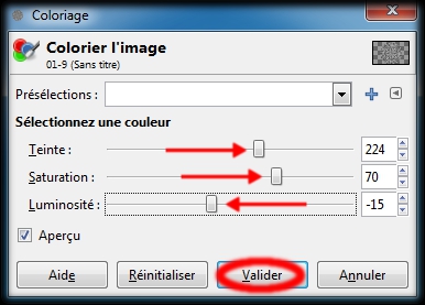 Dans la boite Coloriage,manipulez les glissières afin d'obtenir la couleur qui vous plait,puis un clic gauche sur Valider.